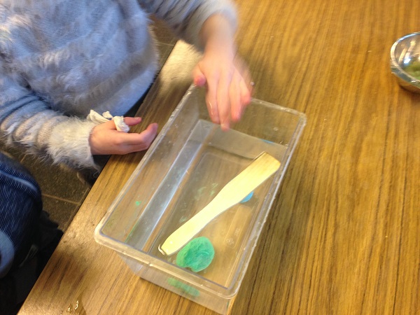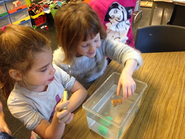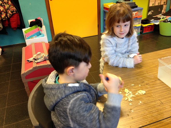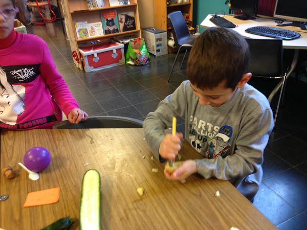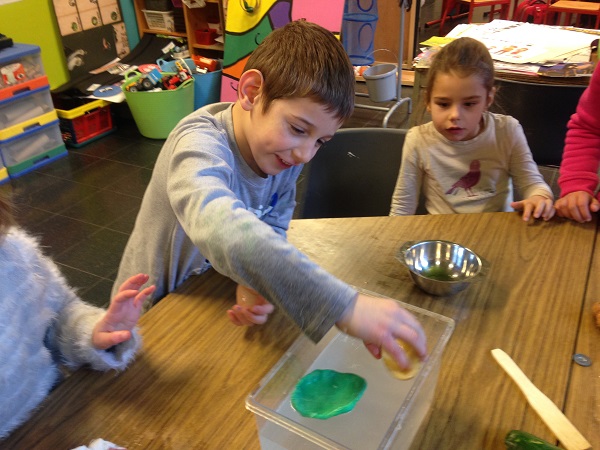 Ensuite, nous avons cherché comment faire. Lucas a suggéré de creuser les 2 légumes. Miley a aplati la plasticine et lui a donné le forme d’un bateau. Nous avons observé le comportement des 3 objets transformés. Ils ont flotté!
