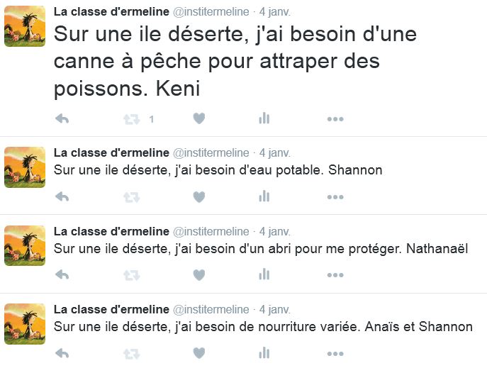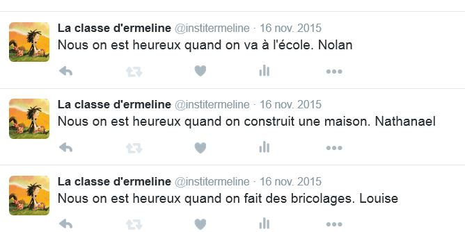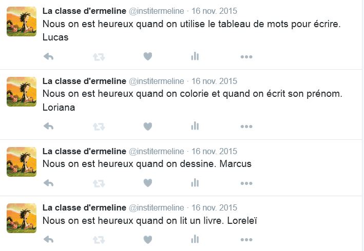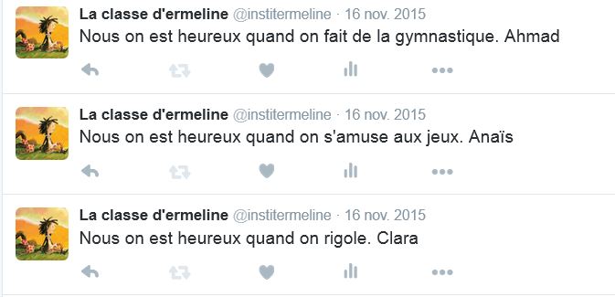 Vous pouvez rejoindre notre classe sur Twitter pour lire nos tweets! Nous participons à plusieurs projets: #tagueson , #twictée , #ProjetPhotoPoésie et d’autres encore au cours de l’année!